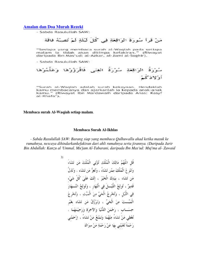 Home » islam » amalan dan doa murah rezeki. Doa murah rezeki dan cepat kaya ayat tu adalah petikan daripada surah sad ayat 54 bacaan oleh sheikh mishary rashid al afasy. 3 doa murah rezeki paling mustajab. *7 amalan murah rezeki* bersedekah secara istiqamah menjalin hubungan silaturrahim mengerjakan haji & umrah taqwa kepada allah swt beribadah lepada allah dengan sebenarnya. Jangan lupa, dalam rezeki kita sebenarnya sentiasa ada bahagian atau hak orang lain.